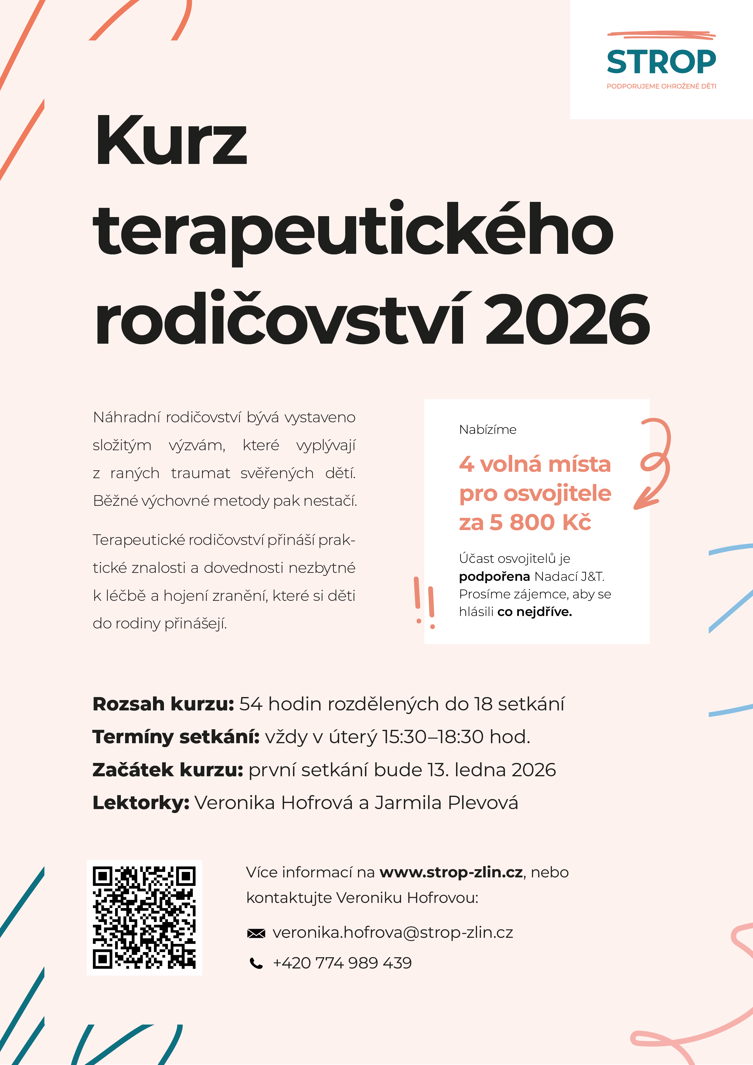 Terapeutické rodičovství přináší praktické znalosti a dovednosti nezbytné k léčbě a hojení zranění, které si děti do rodiny přinášejí. Prostřednictvím kurzu nabízíme možnost ponořit se do světa dětí s traumatem, neztratit v něm sílu, energii, naději a najít a vybudovat cestu pro hezký, spokojený život přijatých dětí a náhradních rodin.