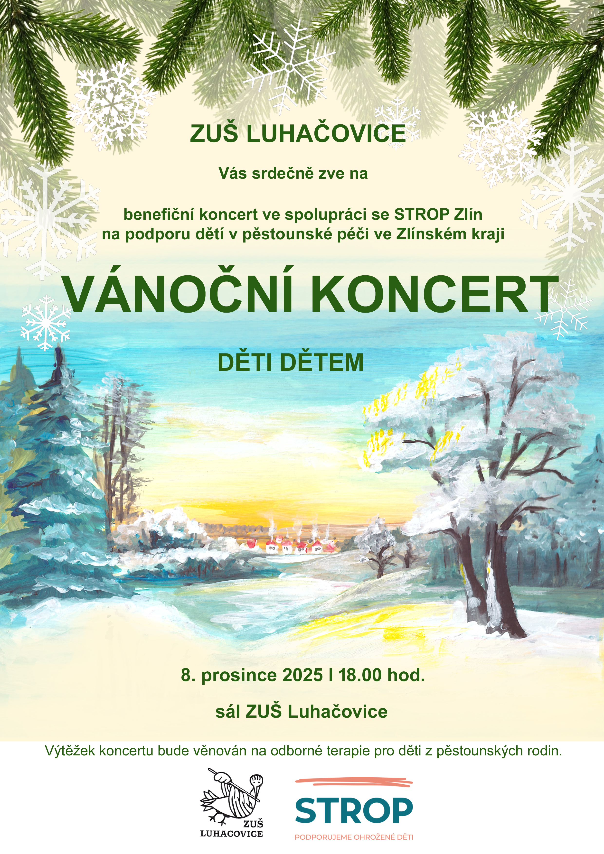 V pondělí 8. prosince 2025 se v Luhačovicích uskuteční krásná událost, která spojuje hudbu, radost a skutečnou pomoc. ZUŠ Luhačovice připravuje vánoční benefiční koncert DĚTI DĚTEM, který pořádá ve spolupráci s naší organizací. Výtěžek koncertu bude věnován na podporu dětí vyrůstajících v pěstounské péči ve Zlínském kraji.